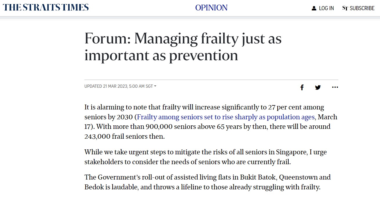 ALFA director Dr. Belinda Wee wrote a letter on The Straits Times forum recently, entitled: “Managing Frailty Just as Important as Prevention”. She stated that it is alarming to note that frailty will increase significantly by 27 percent among seniors by 2030; and urged stakeholders to consider the needs of seniors who are currently frail, while we take urgent steps to mitigate the risks of all seniors in Singapore. Read the letter in full below.